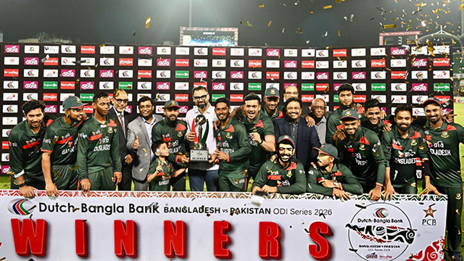 মিরপুরে সিরিজ নির্ধারণী তৃতীয় ওয়ানডেতে নাটকীয় জয় পেয়েছে বাংলাদেশ। ২৯১ রানের লক্ষ্য তাড়া করতে নেমে পাকিস্তান শেষ পর্যন্ত থামে ২৭৯ রানে। ফলে ১১ রানের জয়ে ২–১ ব্যবধানে সিরিজ নিশ্চিত করে মেহেদী হাসান মিরাজের দল। ব্যাট হাতে তানজিদ হাসান তামিমের সেঞ্চুরি এবং বল হাতে তাসকিন আহমেদের চার উইকেট জয়ে বড় ভূমিকা রাখে। শেষ ওভারের উত্তেজনায় রিশাদ হোসেনের নিয়ন্ত্রিত বোলিং নিশ্চিত করে বাংলাদেশের গুরুত্বপূর্ণ জয়।